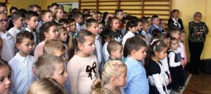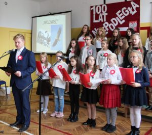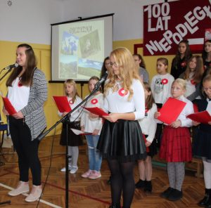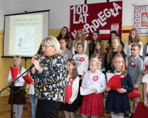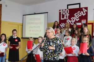Z tej okazji dnia 9 listopada 2018 r. odbył się w naszej szkole apel z okazji setnej rocznicy odzyskania niepodległości. Uroczystość rozpoczęła się od przywitania zebranych przez panią dyrektor B. Skowron i odśpiewania Hymnu Państwowego.