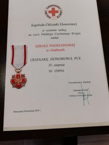 z okazji 60-lecia Honorowego Krwiodawstwa Polskiego Czerwonego Krzyża. Ten dzień był również wyjątkowy dla Szkoły Podstawowej w Grabicach z Filią w Strzegowie. Dyrektor Szkoły Beata Skowron, na zaproszenie Lubuskiego Oddziału Czerwonego Krzyża, uczestniczyła w tej pięknej gali, podczas której szkoła otrzymała Odznakę Honorową PCK w uznaniu zasług na rzecz Polskiego Czerwonego Krzyża.