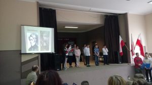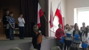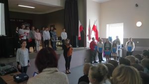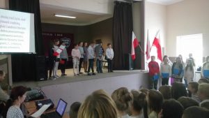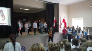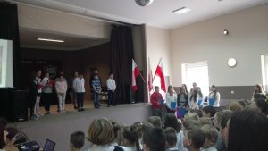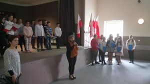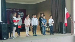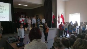 Po powitaniu przez panią Dyrektor i wspólnym odśpiewaniu hymnu, wysłuchaliśmy programu przygotowanego przez klasę IV oraz obejrzeliśmy prezentację multimedialną. Przenieśliśmy się do roku 1791, kiedy miało miejsce uchwalenie Konstytucji 3 Maja – pierwszego w Europie, drugiego w świecie zbioru praw i obowiązków obywateli, kompetencji władzy państwowej i zasad ustroju państwa. Nie zabrakło pieśni patriotycznych: Majowej jutrzenki i Jak długo w sercach naszych w wykonaniu klasy IV i zespołu „Co ty na to”.