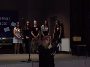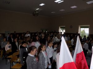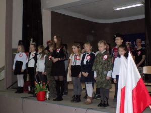 Następnie rozpoczęła się część artystyczna, którą poprzedziło wspólne odśpiewanie Hymnu Państwowego. Uczniowie klasy III Gimnazjum w oryginalny sposób starali się przypomnieć młodszym kolegom historię naszego kraju – czasów, gdy Polska straciła niepodległość i zniknęła na 123 lata z map świata. Urozmaicony program słowno – muzyczny, gra aktorów, wzruszające polskie pieśni patriotyczne w wykonaniu chóru i solistów, zmuszały do refleksji nad przeszłością naszego narodu. Rozbiory i utrata własnej państwowości nie załamały jednak narodu polskiego, w którym przetrwała wola istnienia i uparte dążenie do odzyskania niepodległości. Jakże wymowne były słowa Dominiki Pszenicznej, która wcielając się w rolę Polski wypowiedziała słowa: ,, Dziś jestem wolna i niepodległa, ale to od was zależy, czy taką pozostanę na zawsze’’.