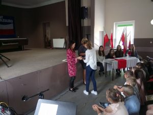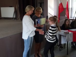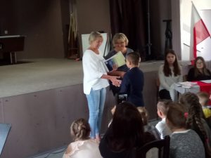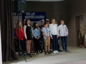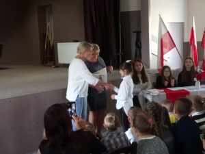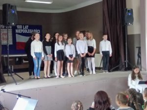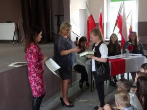 Jury ( grono pedagogiczne) pod przewodnictwem p.dyrektor Beaty Skowron uznało za najlepiej śpiewający zespół: klasę IV- 1miejsce, klasę II gimnazjum-2miejsce i III gimnazjum-3miejsce.To tu, podczas przeglądu, wręczono dyplomy oraz nagrody laureatom konkursu plastycznego i recytatorskiego. Świętowaniu piosenki patriotycznej towarzyszyła miła atmosfera.