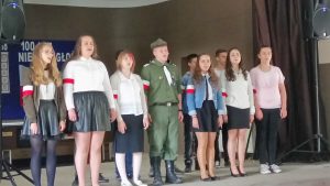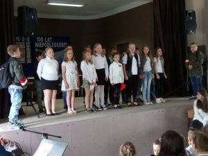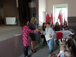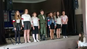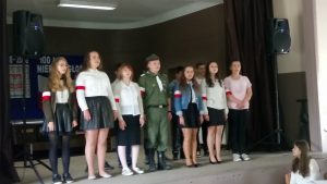 17 maja br. odbył się przegląd Piosenki Patriotycznej i Żołnierskiej. W tym przedsięwzięciu zaangażowane były klasy IV-VI szkoły podstawowej oraz II i III klasa gimnazjum. Zadaniem wyżej wymienionych było przygotowanie, zaprezentowanie, a tym samym  przywrócenie zbiorowej pamięci, niektórych zapomnianych już, polskich pieśni patriotycznych. Mieli tu zatem swoje miejsce ułani, strzelcy, czy też żołnierz, który zgubił swoje serce w plecaku. Konferansjerzy – uczniowie klasy III gimnazjum zadbali o to, aby  każdą piosenkę poprzedziła historia jej powstania.