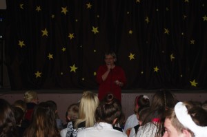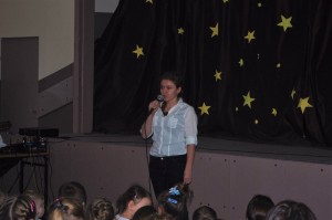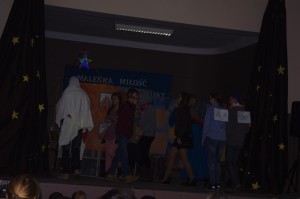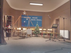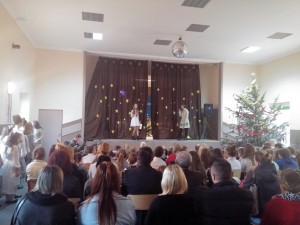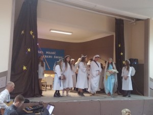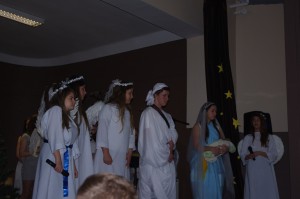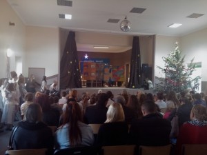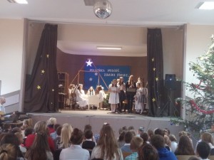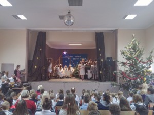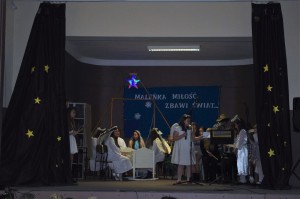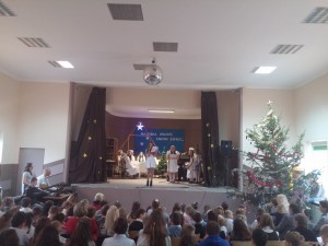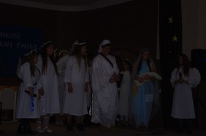 Na szkolne jasełka składały się z dwie sceny. Pierwsza część przedstawienia dotyczyła życia zwykłych ludzi, różnych pokoleń, w którym nie ma czasu na miłość i Boga, który jest Miłością. Uczniowie klasy drugiej gimnazjum w sposób pantomimiczny ukazali codzienne życie dzieci i dorosłych, u których nadmiar obowiązków powoduje ciągły pośpiech i brak czasu. Mały Książę, w rolę którego wcieliła się Marlena Łaska słusznie potwierdziła znaną myśl, że ,,Dobrze się widzi tylko sercem’’. Drugą część przedstawienia stanowiła scena z historii Narodzin Jezusa, któremu liczni Aniołowie , Pasterze , Trzej Królowie oddają hołd. Trudno było nie zauważyć ambitnie przygotowanych do swojej roli uczniów. Gimnazjaliści z prawdziwą starannością wypowiadali ważne treści, stosując przy tym właściwą gestykulację i postawę . Stroje przygotowane przez rodziców, odpowiednio dobrane, dopełniły całość przedstawienia.