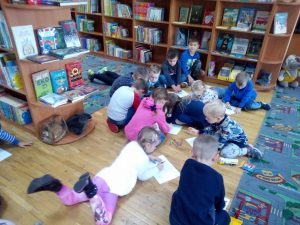 dzieci wykonały rysunki, które miały trafić na wystawę do biblioteki. Po wizycie w bibliotece